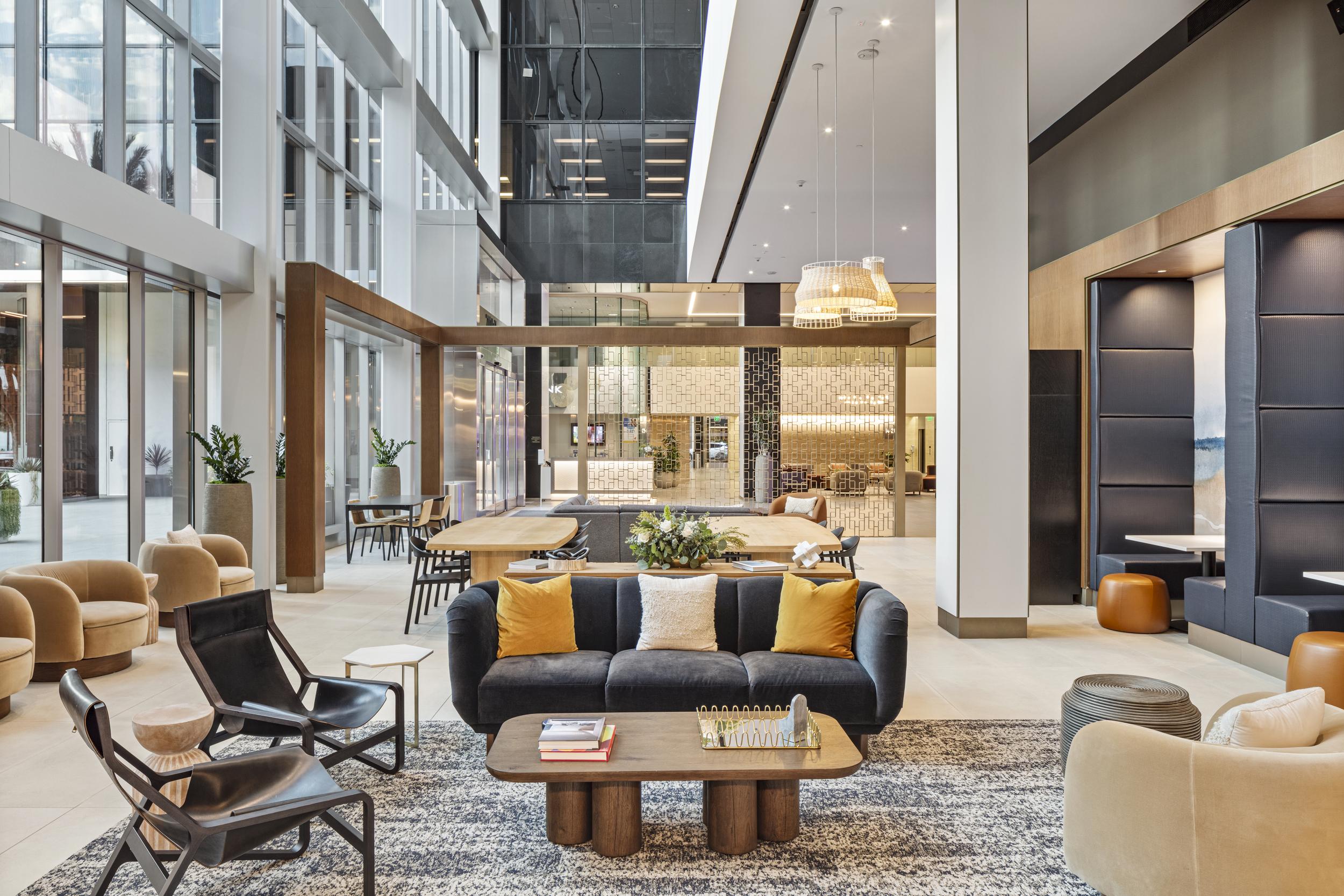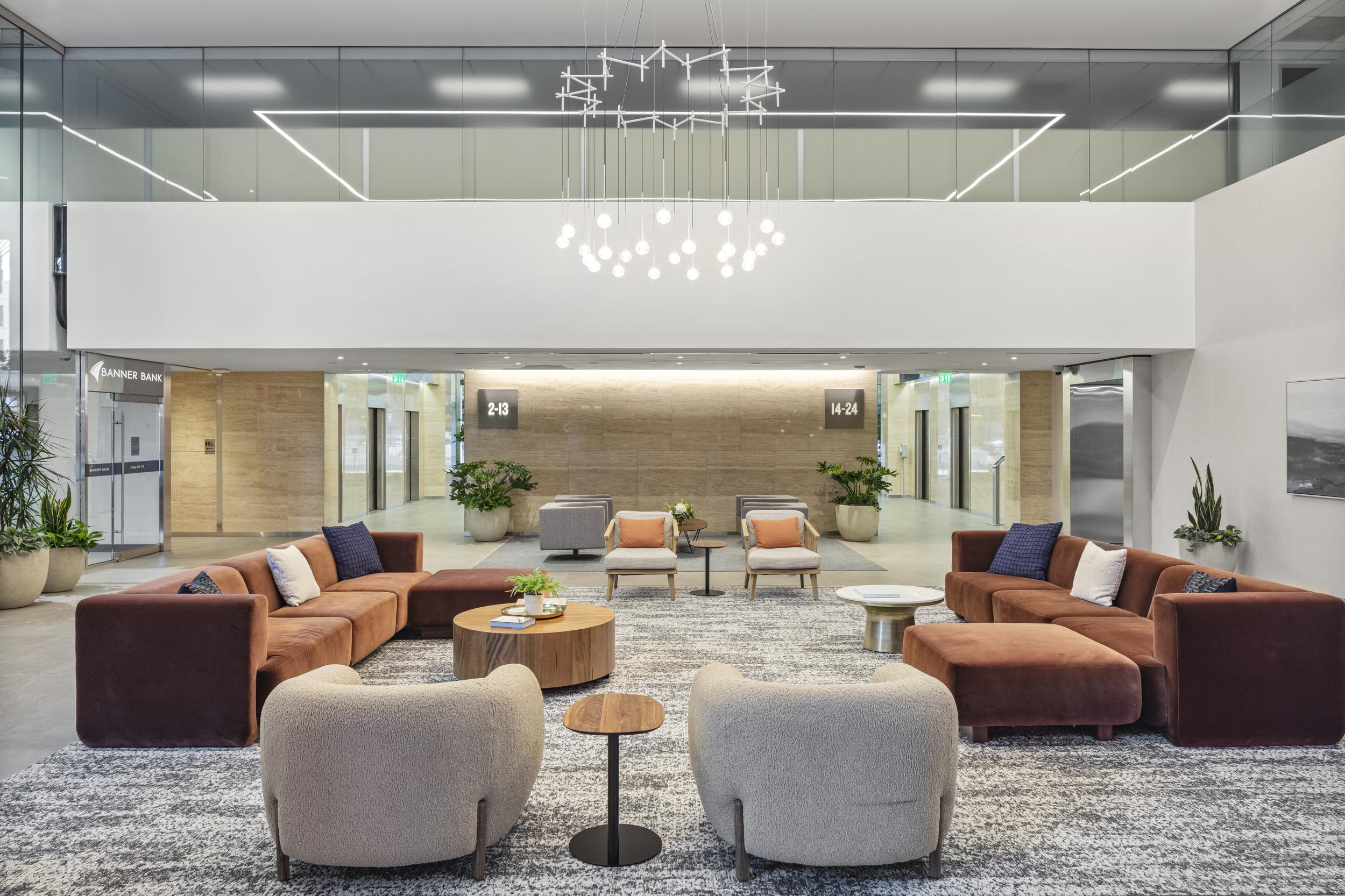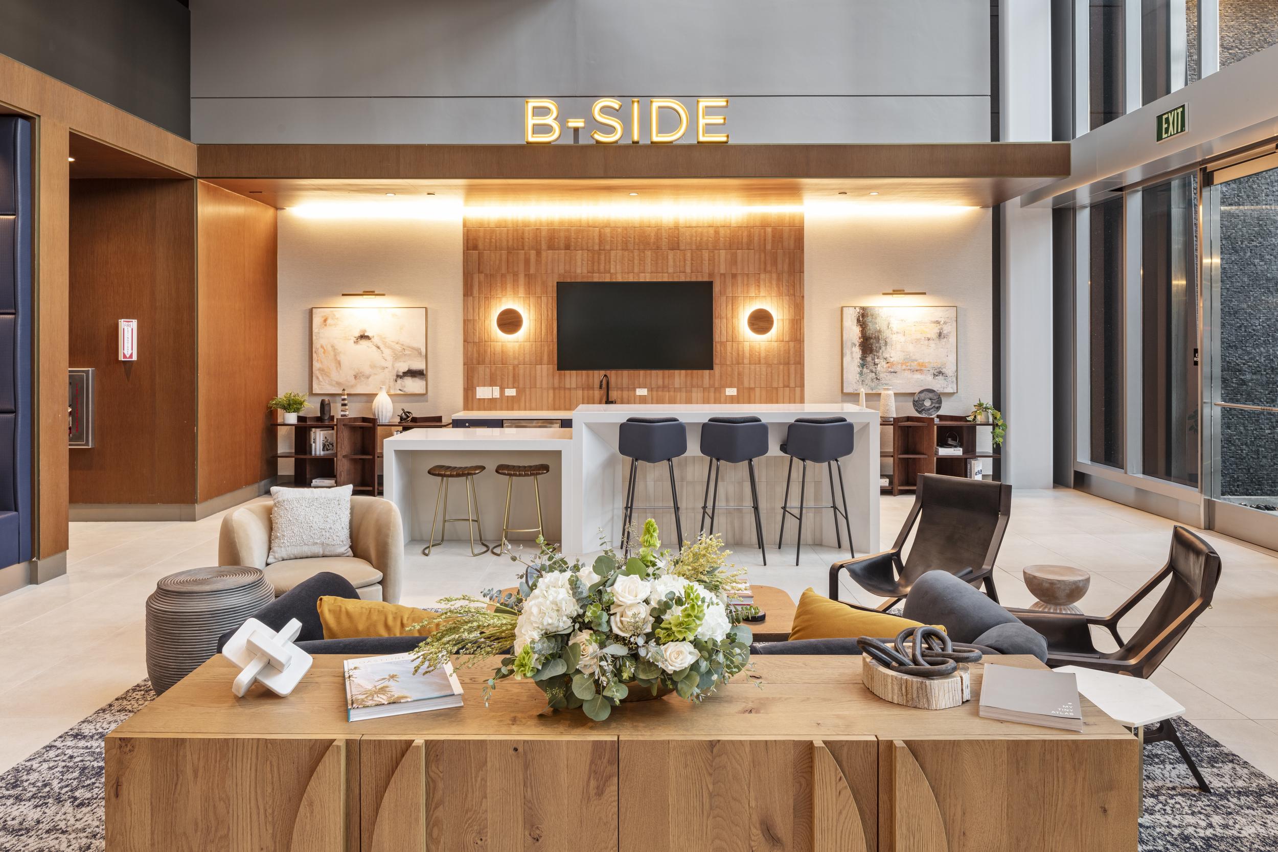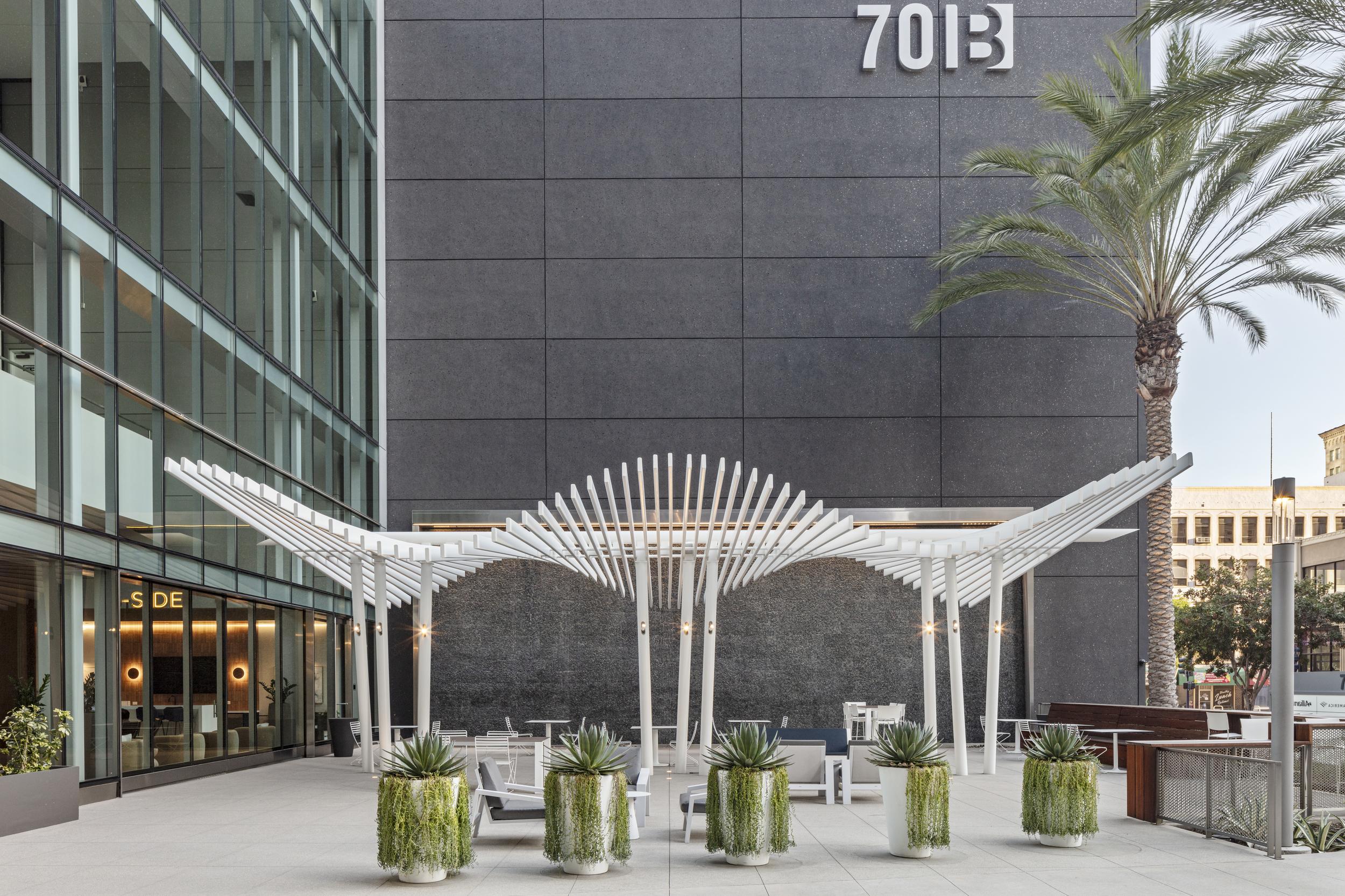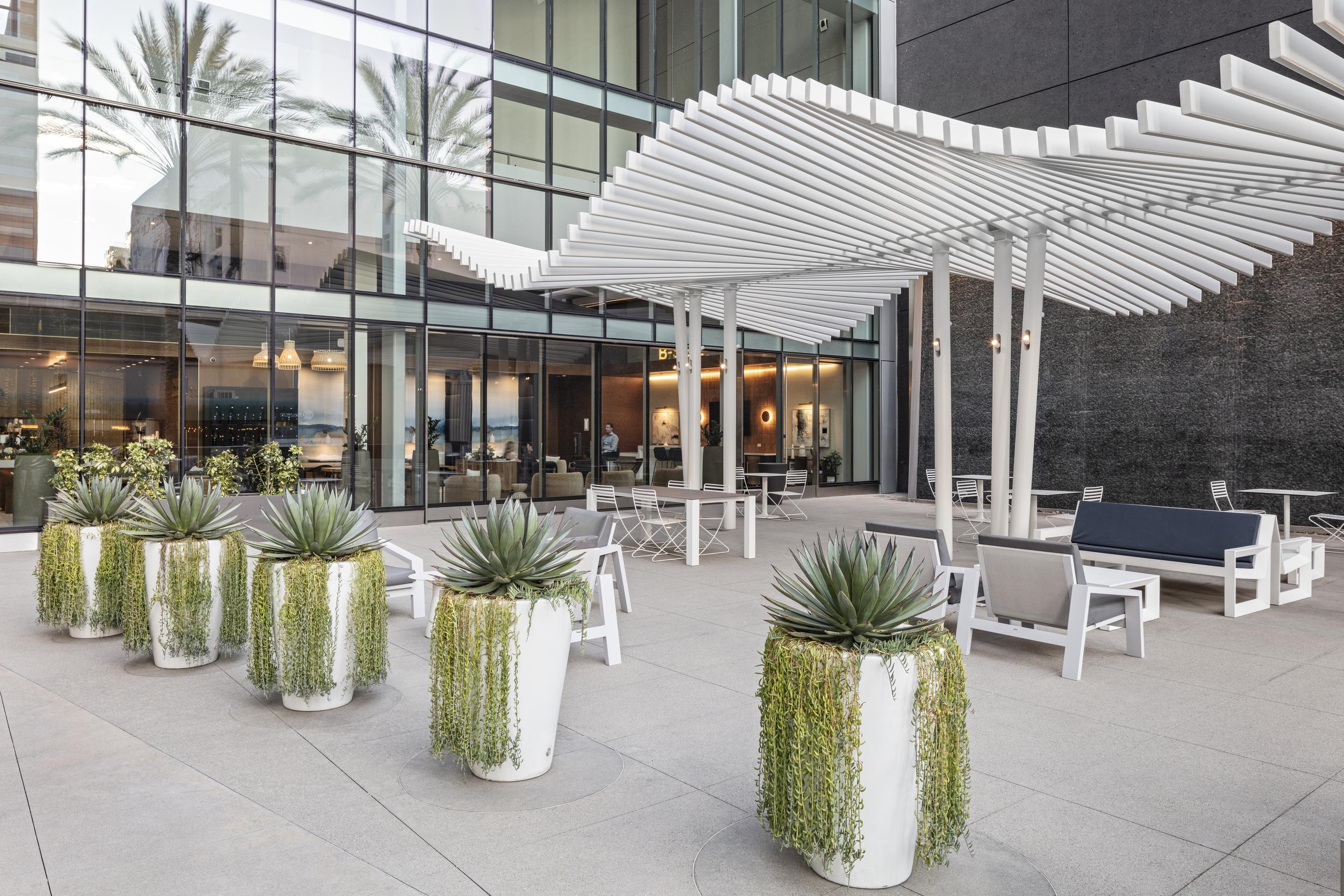 Outdoor Patio with Seating, Dining Areas, and Waterwall Feature